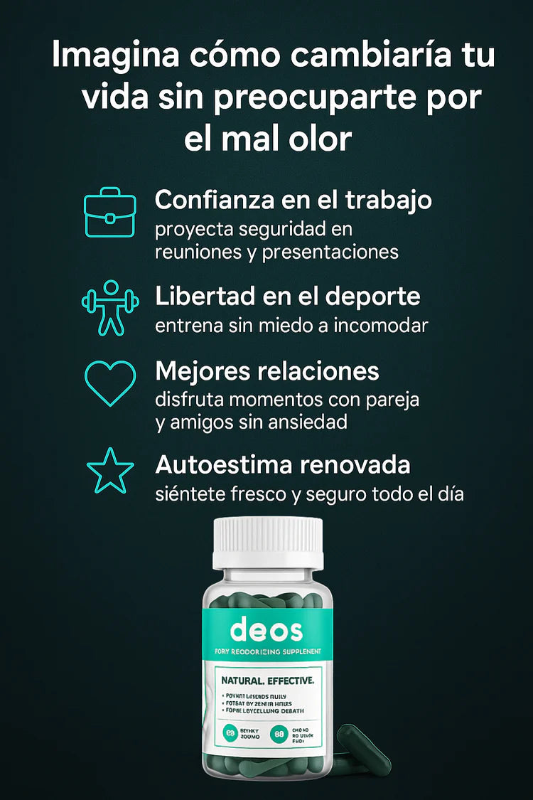 Nuestro suplemento deodorante de nueva generación ha sido desarrollado con una fórmula moderna que actúa desde el interior, ayudando a eliminar el mal olor de forma segura y progresiva. A diferencia de soluciones temporales, ofrece un resultado más duradero, brindando una sensación de frescura continua durante todo el día.